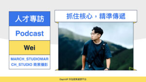 過去曾擔任大型企業專任攝影師的Wei,與捷安特、美利達、屋馬……等知名客戶皆有美好的合作經驗;目前與團隊共同經營「March_studieo商業攝影」,主要服務項目:從「平面攝影」到「動態影像」,包含服飾、食物、產品、活動、企業形象、品牌形象、紀錄片、防疫影片、奧運選手宣傳影片……等,皆擁有豐富的經驗。